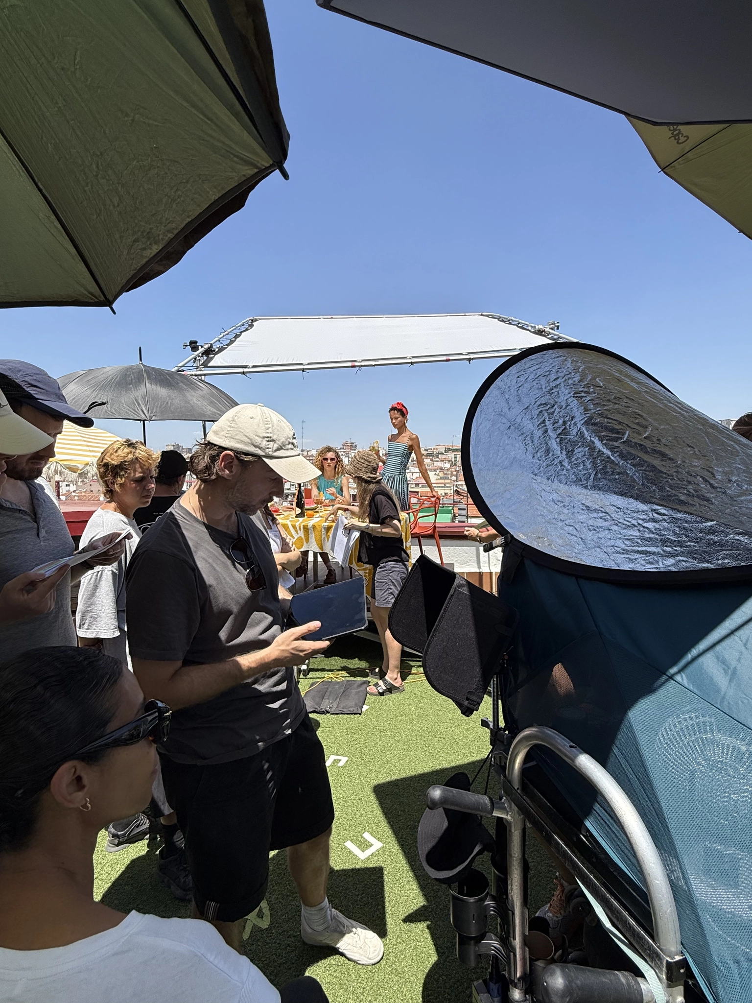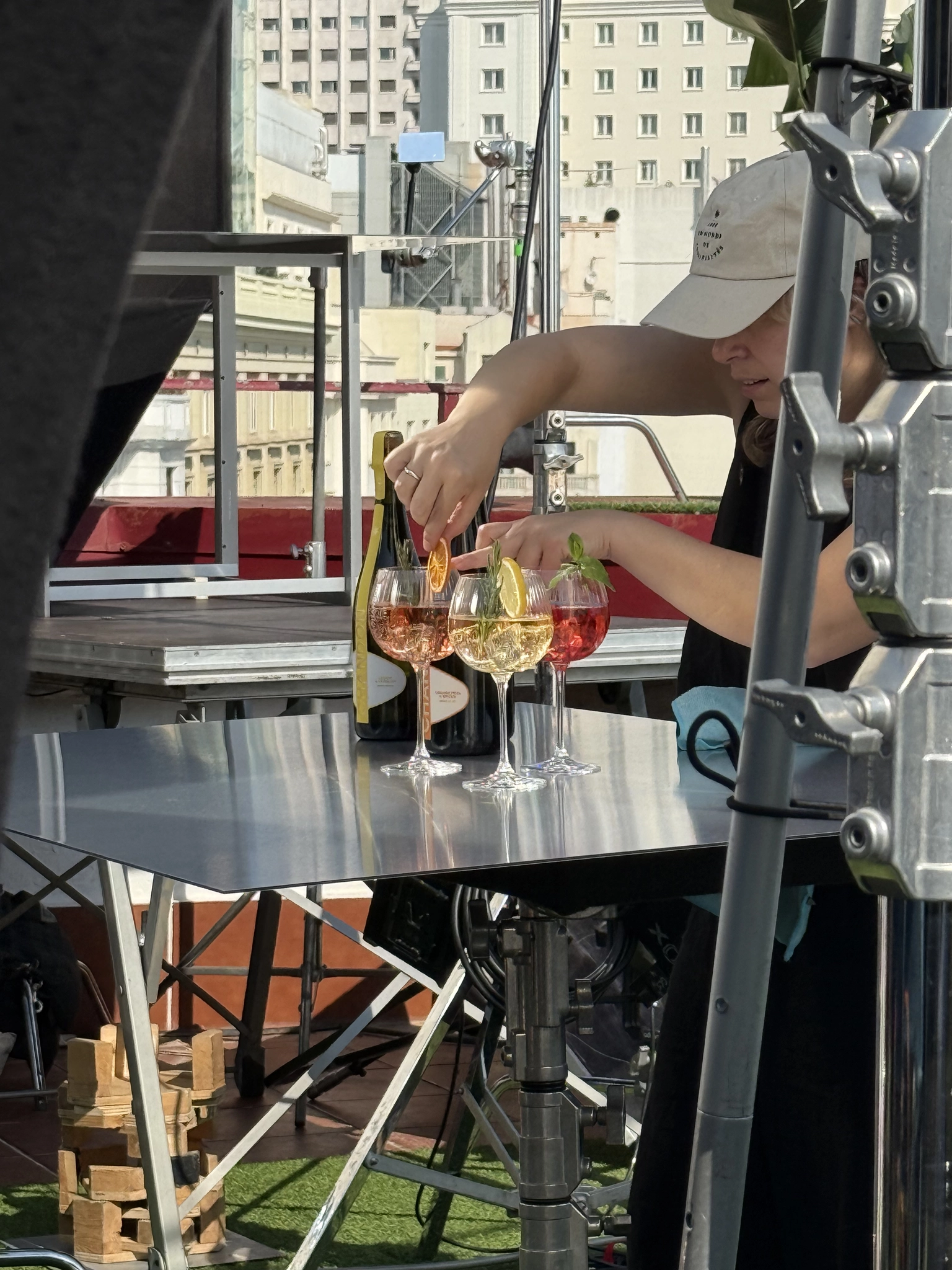 Finding the perfect location with the exact look and feel Chandon needed, right in the middle of Madrid’s summer, was a challenge on its own. And yes, shooting under the July sun on a rooftop adds an extra layer of difficulty… especially for the ice cubes desperately trying to keep drinks and props looking fresh. (Insider secret: as cool as everything appears, not every prop is what it seems.)