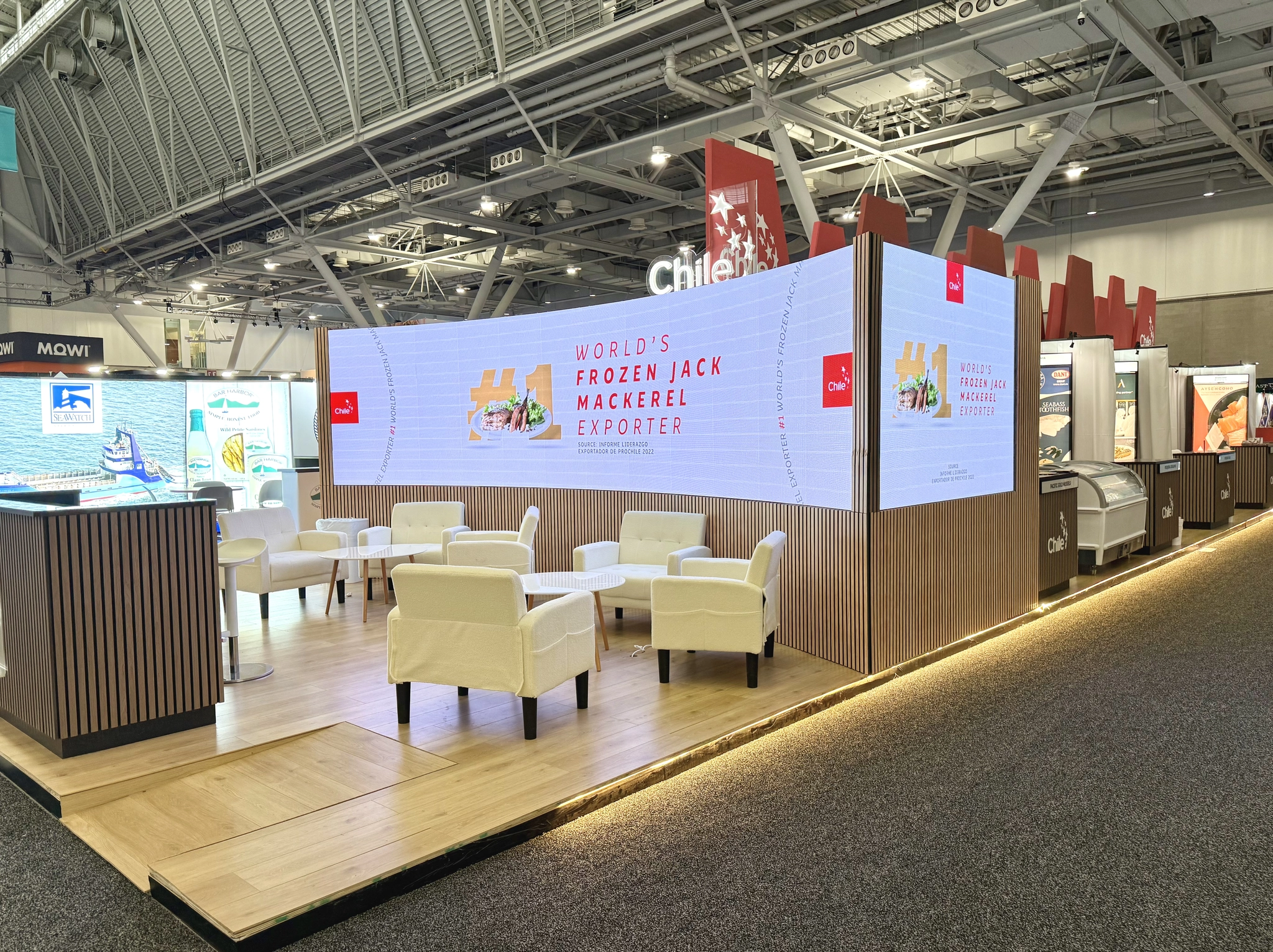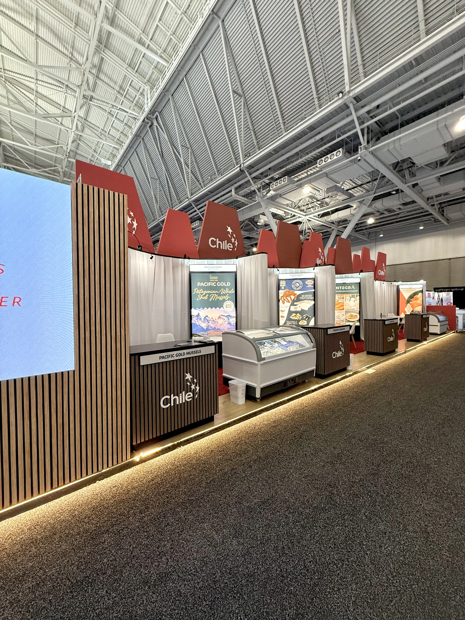 For ProChile, the objective was to consolidate Chilean seafood exporters under a unified national presence while allowing each company clear brand visibility within the pavilion.